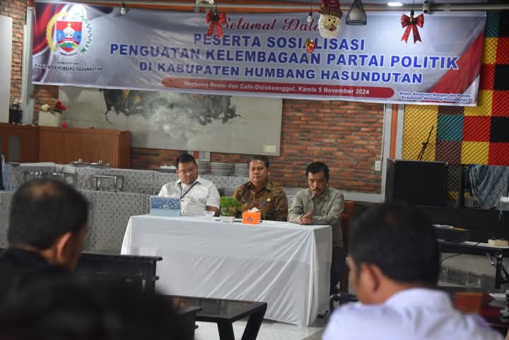 Humbahas, Sinar24Jam.com – Pemerintah Kabupaten Humbang Hasundutan melalui Badan Kesatuan Bangsa dan Politik mengadakan sosialisasi penguatan kelembagan Parpol (Partai Politik) bertempat di Marbona Resto dan Café Doloksanggul, Kamis (5/12).