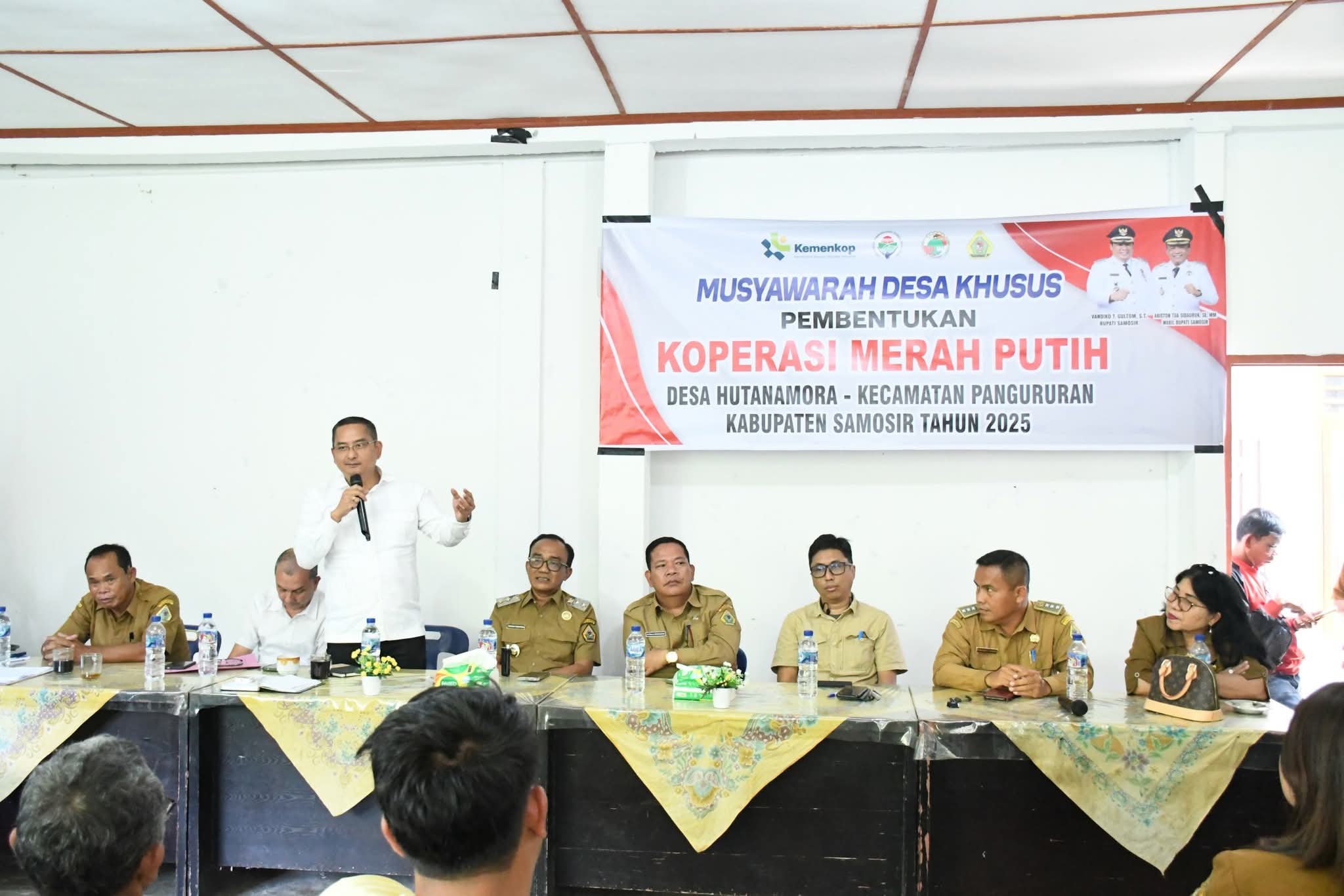 Wakil Bupati Ariston Tua Sidauruk menyampaikan suatu kehormatan bagi Desa Hutanamora bahwa proses pemilihan pengurus Koperasi Merah Putih disaksikan oleh tim dari Kementerian Koperasi RI.