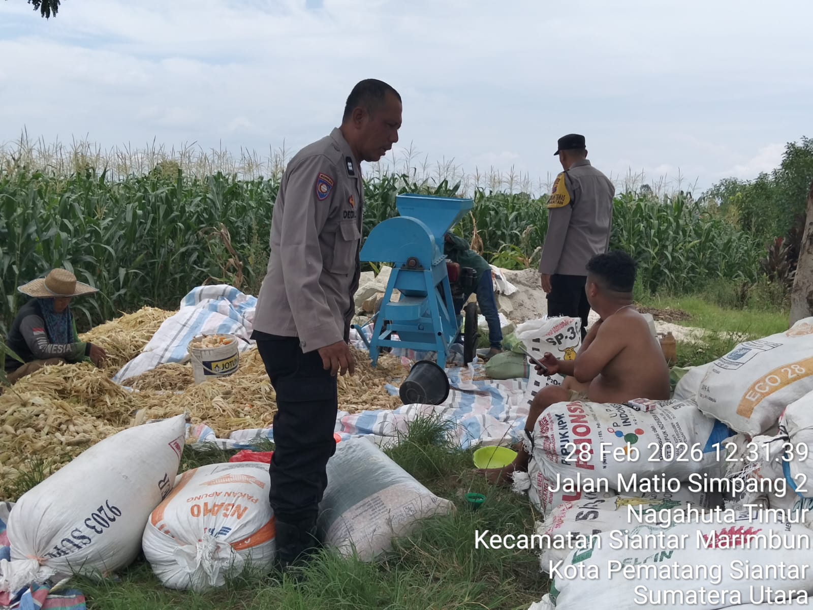 Polsek Siantar Barat Polres Pematangsiantar melalui Bhabinkamtibmas Kelurahan Timbang Galung AIPTU Deddy Syam dan Bhabinkamtibmas Kelurahan Bantan AIPTU R.P Damanik menyambangi ladang jagung milik Ibu Nuraida Tampubolon di Kampung Matio, Kelurahan Nagahuta, Kecamatan Siantar Marimbun, Kota Pematangsiantar, Sabtu (28/02/2026) sekira pukul 12.30 WIB.