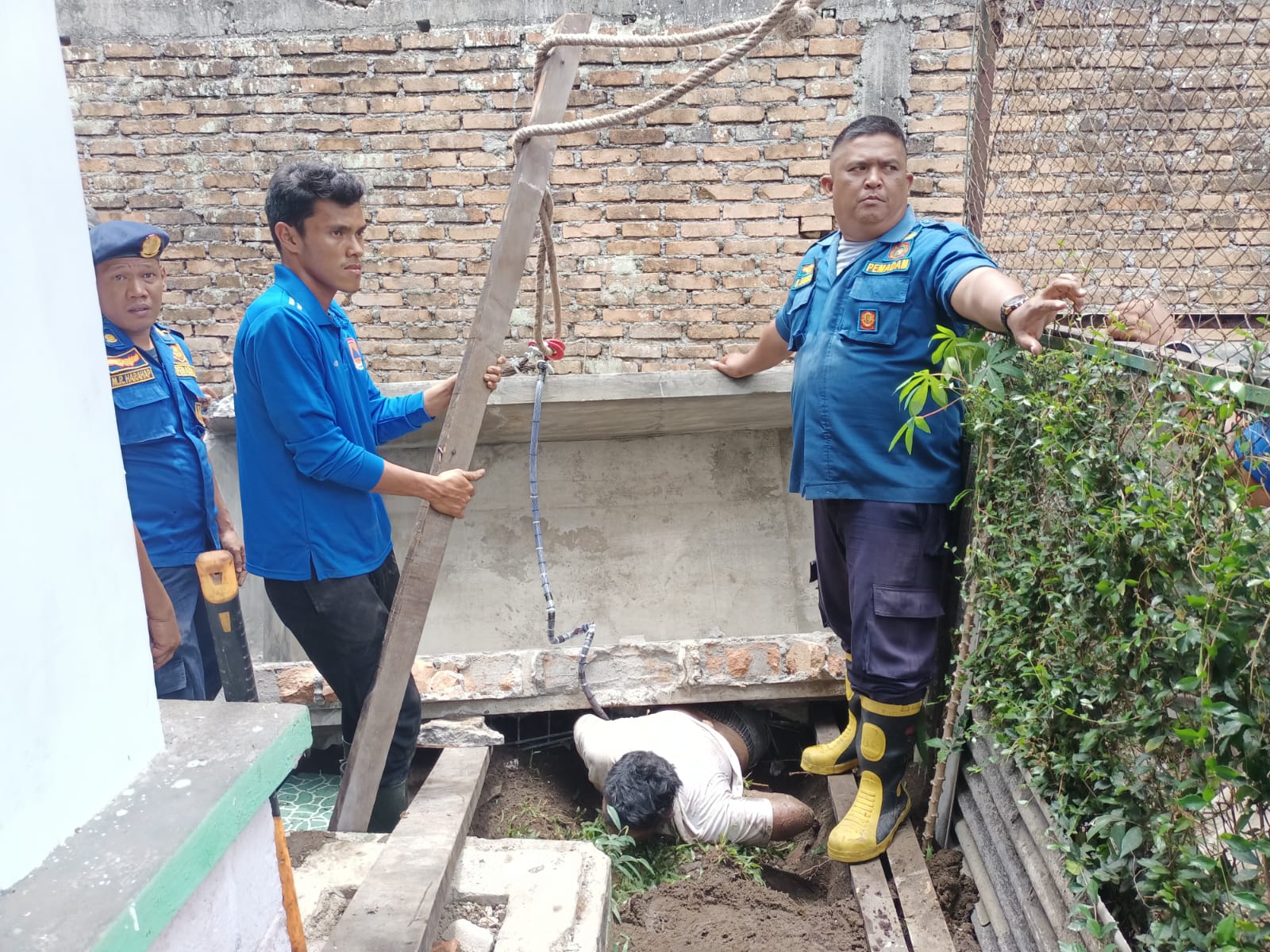 Setibanya di lokasi, tim Damkarmat langsung melakukan upaya penyelamatan dengan mencoba mengangkat beton menggunakan alat dongkrak sederhana. Namun usaha itu tidak berhasil karena beratnya material yang diperkirakan mencapai sekitar lima ton.