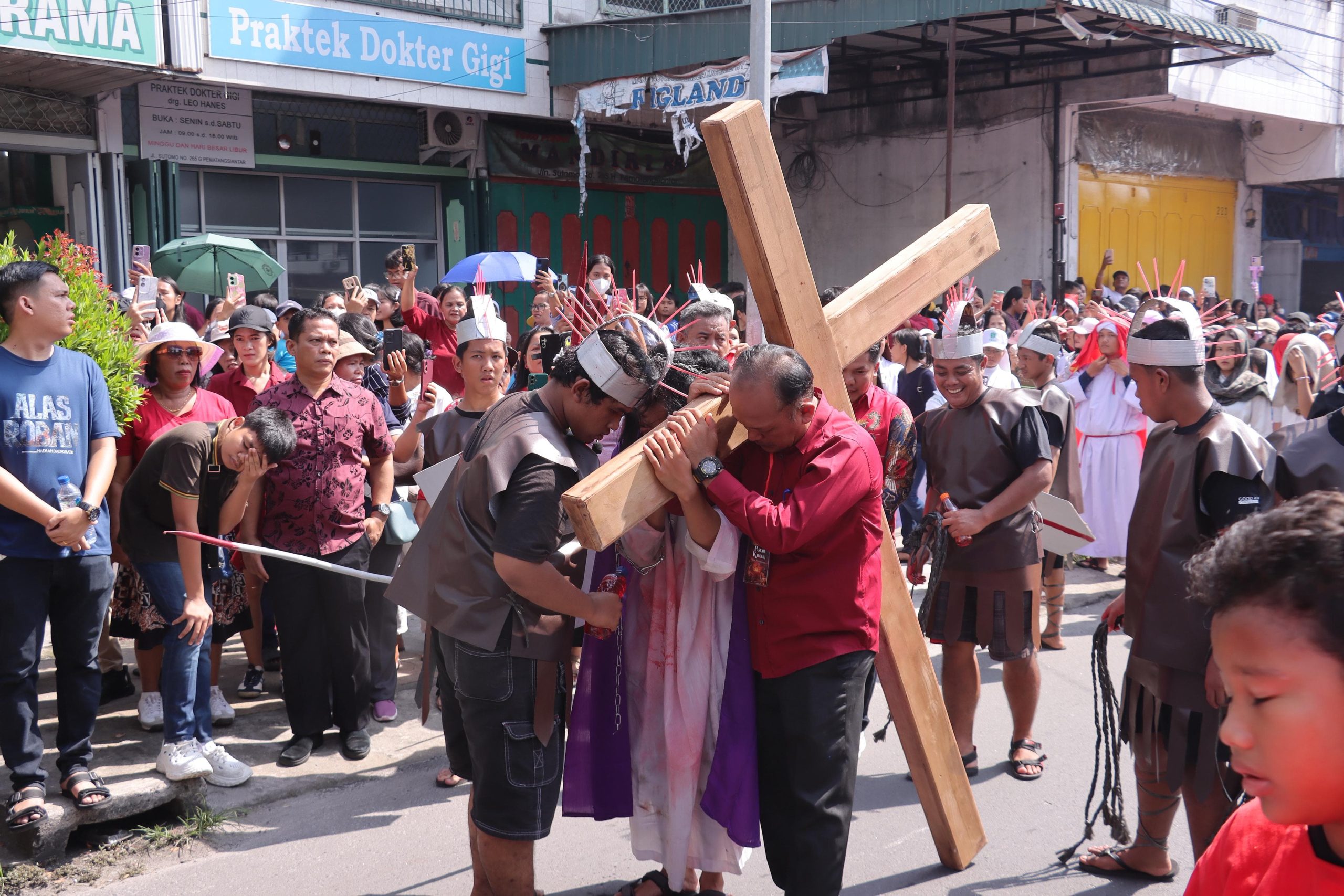 Tidak hanya melakukan pengamanan, Kapolres Pematangsiantar juga ikut ambil bagian dalam prosesi, termasuk dalam simbolisasi “pikul salib” serta penyerahan kain putih dengan gambar Yesus dalam rangkai jalan Salib, sebagai bentuk penghormatan dan toleransi terhadap pelaksanaan ibadah umat Kristiani.